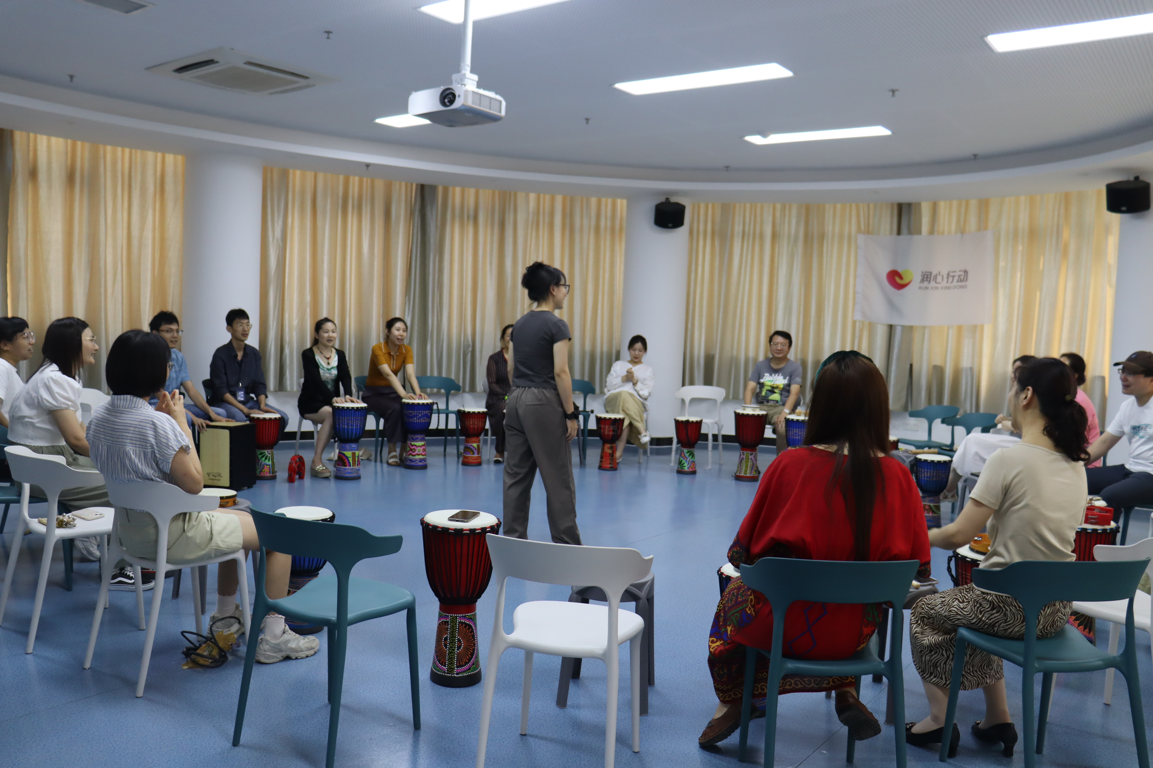 校工会邀请学生工作处心理健康教育中心吴安莲老师教授教职工们进行这两场放松身心的活动。正念冥想活动伊始,吴老师深入讲解了“正念冥想”的含义,随后,她带领老师们跟随轻柔舒缓的音乐进行了腹式呼吸、静坐冥想和躯体扫描等环节体验,帮助老师们缓解焦虑、促进睡眠。在鼓圈减压活动中,吴老师通过介绍鼓圈的起源、发展和作用,让老师们快速感受到了这项活动的趣味性,随后大家在吴老师的指导下利用手中的乐器,通过拍打和演奏,共同创作出了美妙的音乐旋律,音乐游戏环节,场内一片欢声笑语,充分舒缓了老师们的身心。