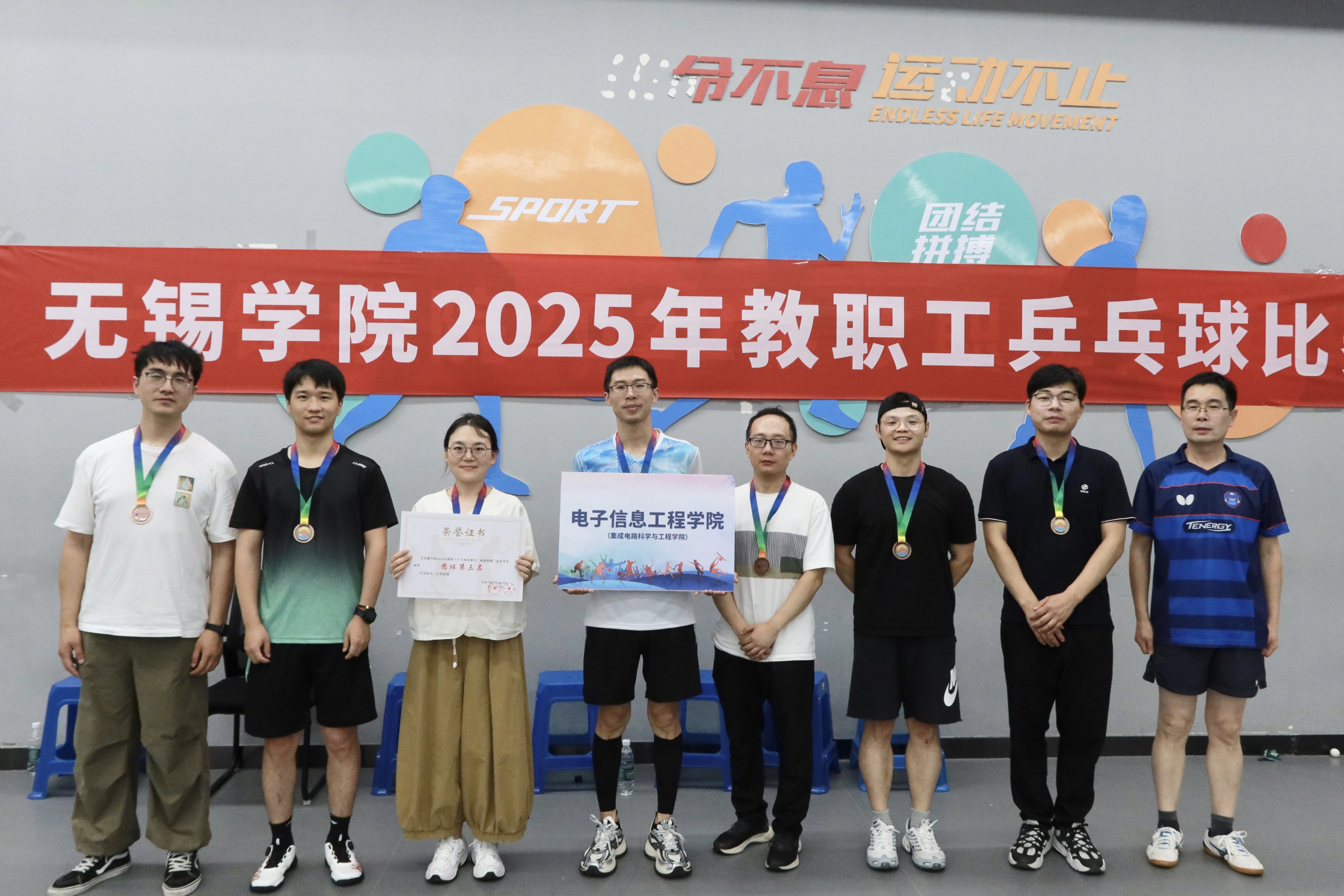 比赛采用小组赛、半决赛和决赛三阶段赛制,设有男单、女单、混双、男双等项目。赛场上,选手们精神饱满、斗志昂扬,展现了高超的球技和顽强的拼搏精神。扣杀、削球等精彩瞬间频现,现场掌声不断,气氛热烈。最终,机关二代表队荣获冠军,机关一代表队荣获亚军,电子信息工程学院荣获季军。