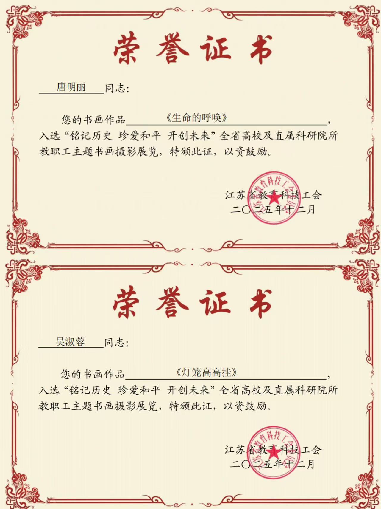 近日,江苏省教育科技工会公布了“铭记历史 珍爱和平 开创未来”主题书画摄影展入选情况,我校推荐的作品中共有2幅成功入选。